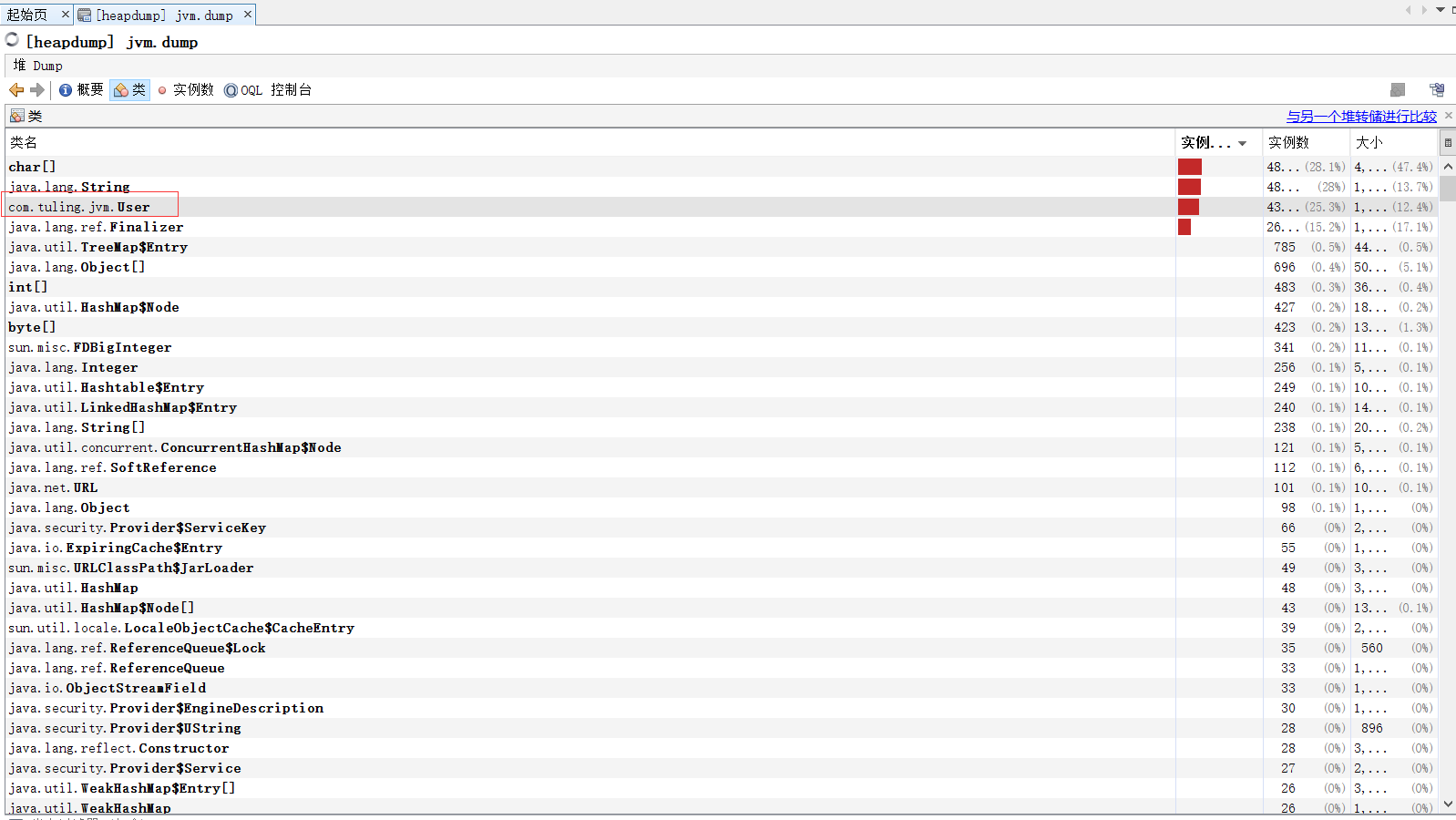 可以用 jvisualvm 命令工具导入该 dump 文件分析